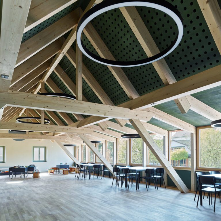 Construite au XIXe siècle entre deux parties du village, l’école s’est transformée en un campus éducatif moderne et ouvert, situé dans un cadre paysager. Les nouveaux bâtiments s’inspirent des écoles pavillonnaires d’après-guerre et privilégient la lumière, l’aération et le lien avec la nature. Les espaces verts et les chemins piétonniers relient naturellement les bâtiments scolaires et les deux parties du village.