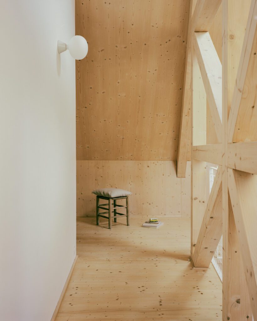 Les panneaux massifs en bois NOVATOP forment ici les murs et les plafonds, qui restent apparents à l’intérieur. La structure n’est pas dissimulée, mais devient une partie naturelle de l’architecture et de son atmosphère.